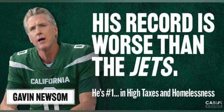 - A California business group has erected a billboard in Times Square during Super Bowl week that draws a comparison between California Governor Gavin Newsom and the New York Jets.